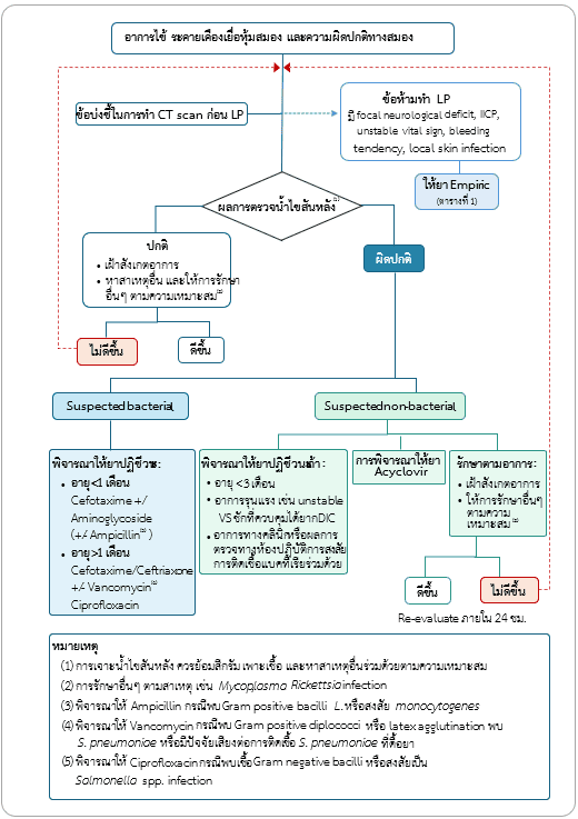 - การรักษาด้วยยาปฏิชีวนะแบบ empiric ก่อนทราบผลเพาะเชื้อ ให้พิจารณาตามข้อมูลทางระบาดวิทยา ผลการตรวจน้ำไขสันหลังเบื้องต้น การย้อมสีกรัม และการตรวจหาแอนติเจน (ถ้ามี) โดยพิจารณาให้ยาปฏิชีวนะดังแผนภูมิที่ 1 และ ตารางที่ 1 เมื่อได้ผลทางห้องปฏิบัติการจนทราบเชื้อที่เป็นสาเหตุ สามารถให้ยาตรงตามเชื้อและแบบแผนความไวต่อยา